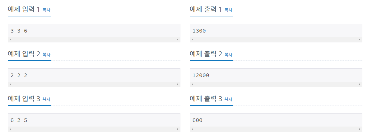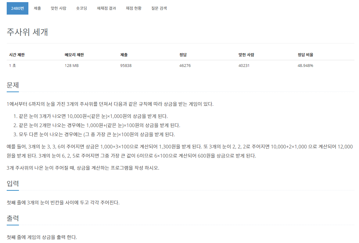 ๋ฌธ์ : 3๊ฐ ์ฃผ์ฌ์์ ๋์จ ๋์ด ์ฃผ์ด์ง ๋, ์๊ธ์ ๊ณ์ฐํ๋ ํ๋ก๊ทธ๋จ์ ์์ฑ ํ์์ค.