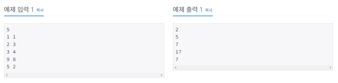입력 : 첫째줄에 테스트 개수 T가 주어지고 각 테스트는 한줄로 각 A와 B가 주어짐.