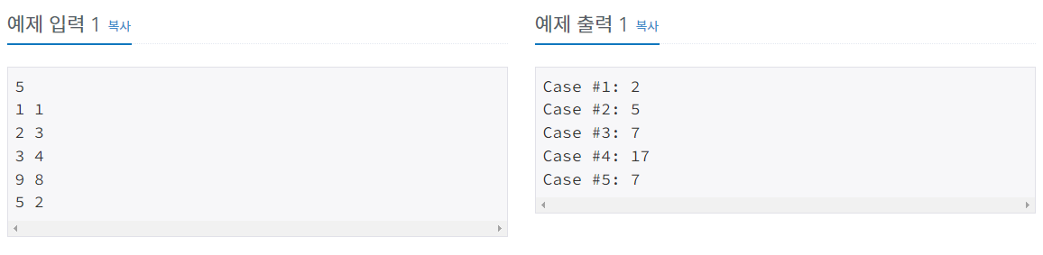 ์ถ๋ ฅ :๊ฐ ํ ์คํธ ์ผ์ด์ค๋ง๋ค "Case #x: "๋ฅผ ์ถ๋ ฅํ ๋ค์, A+B๋ฅผ ์ถ๋ ฅํ๋ค. ํ ์คํธ ์ผ์ด์ค ๋ฒํธ๋ 1๋ถํฐ ์์ํ๋ค.
