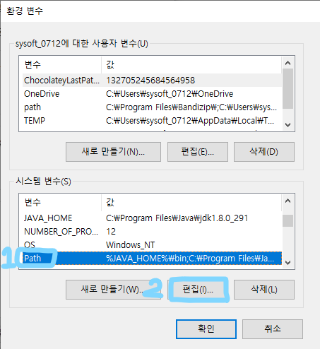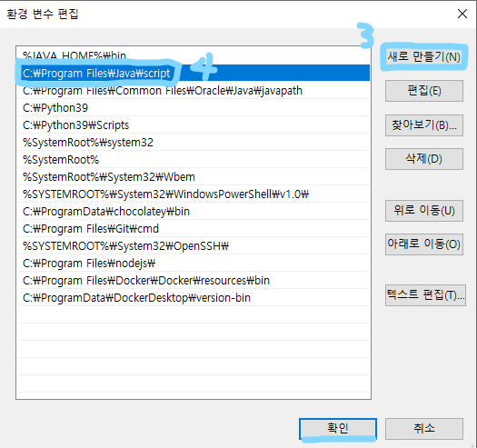 - ์๋ก๋ง๋ค๊ธฐ > %JAVA_HOME%\bin ์ ๋ ฅ > ํ์ธ ๋ฒํผ ํด๋ฆญ